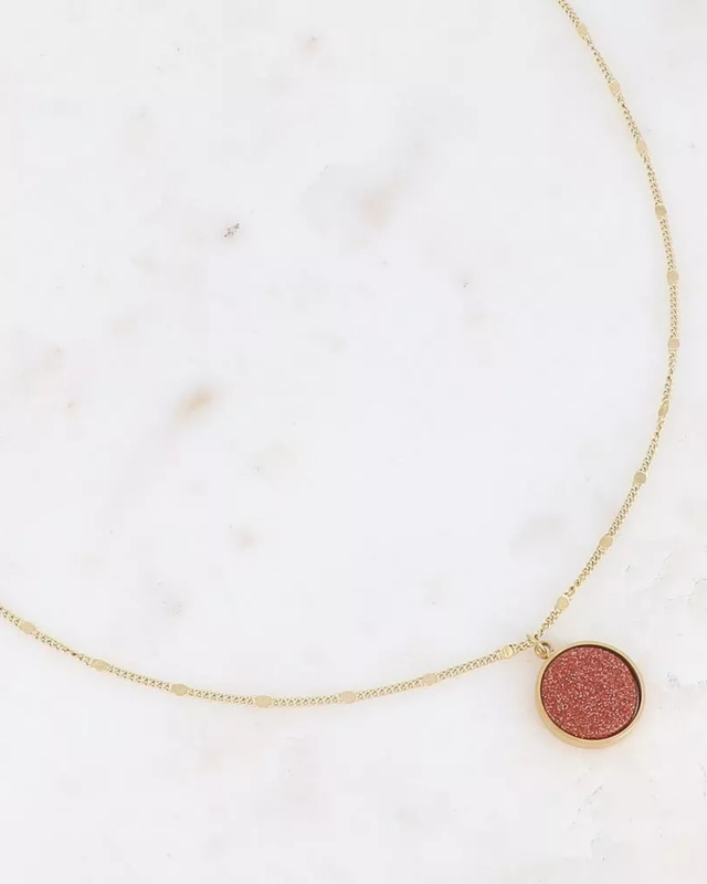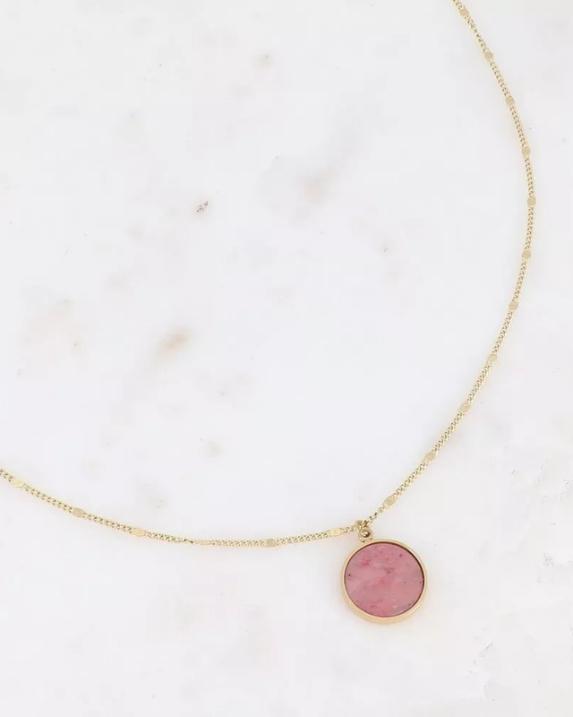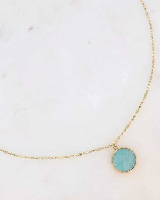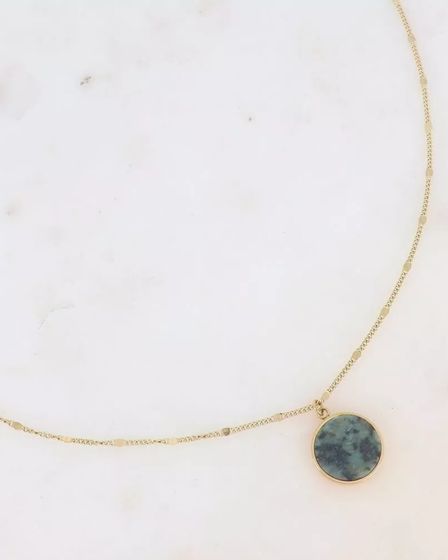 Collier sur chaîne en acier inoxydable composé d'une maille forçat alternée plat et d'un médaillon rond en pierre naturelle.